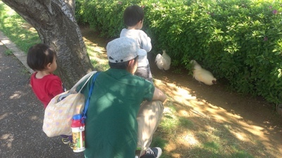先日、子供達と公園に遊びに行ったのですが、軽いアスレチックのある場所に移動していたところ、生垣の中にニワトリが4・5匹住んでました。
